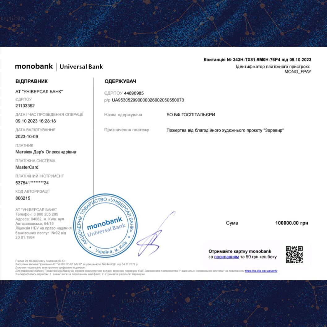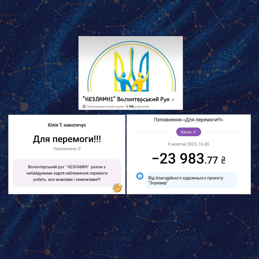 "Зоревир" — перший некомерційний благодійний артбук, в якому зібрані ілюстрації художників та художниць з різних куточків України. Усі вони пов'язані однією темою — персоніфікація сузір'їв.Завдяки неймовірному відгуку учасників та покупців було надруковано 420 примірників разом з мерчем. Прибуток з передзамовлень та допродажу був переданий медбату "Госпітальєри" (100 000 грн) та волонтерському руху "НЕЗЛАМНІ" (23 983.77 грн). Також завдяки благодійному розіграшу двох примірників було передано 10 760.41 грн на збір від @bielova.liza на КЕЙСЕВАК для медиків 47 ОМБр.